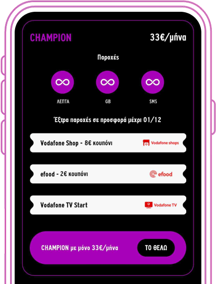 👉 Άμεση επιβράβευση για την πιστότητα σου, κάθε μήνα σε κουπόνια για τις παραγγελίες σου στο μεγαλύτερο delivery app της Ελλάδας, το efood και για αγορά νέου smartphone από τα καταστήματα Vodafone